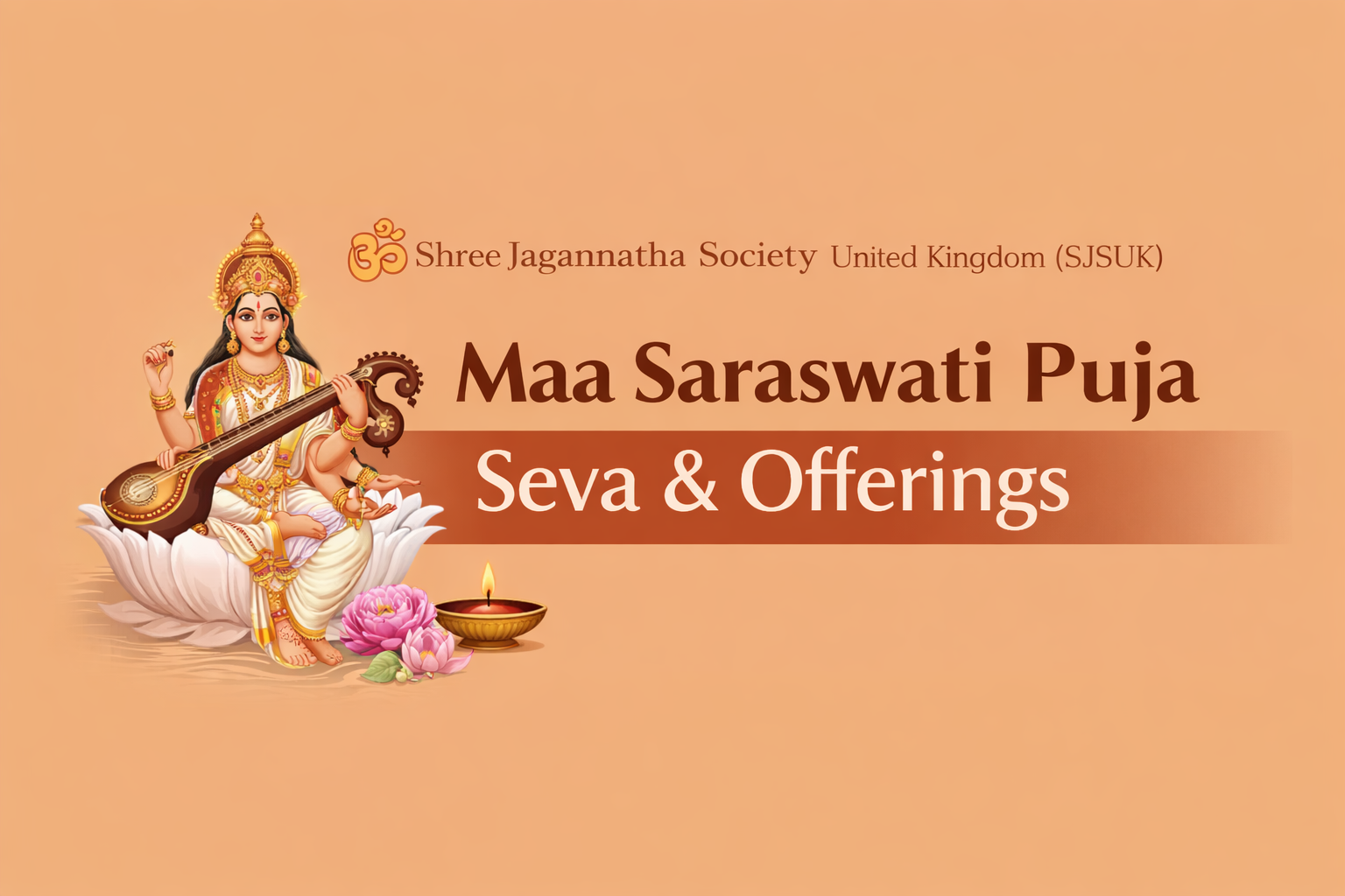 The Shree Jagannatha Society UK (SJSUK) cordially invites you and your family to celebrate Maa Saraswati Puja – 2026, a sacred occasion dedicated to Goddess Saraswati, the deity of knowledge, wisdom, music, and learning.